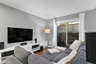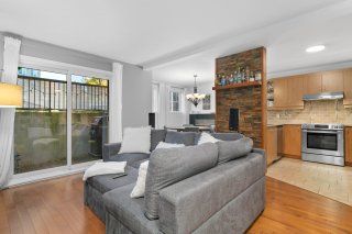 SALON -- Porte-patio menant directement à l'espace extérieur privé. Plancher de bois franc, fenestration généreuse et aménagement flexible pour sectionnel, coin télé ou lecture. Lumière stable et volume agréable au quotidien.