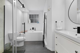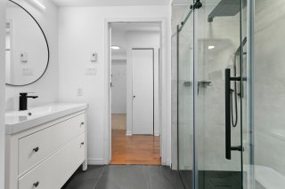 SALLE DE BAIN -- Complète et rénovée au goût du jour, avec finitions actuelles et rangement intégré. Aménagement pensé pour l'entretien et le confort.