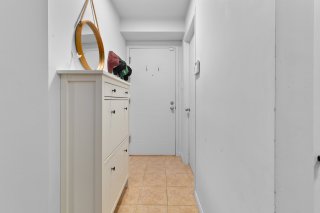 HALL D'ENTRÉE -- Porte coupe-feu, garde-robe aménagé et plancher de céramique, accueil pratique. Le hall offre un dégagement efficace et limite l'encombrement.